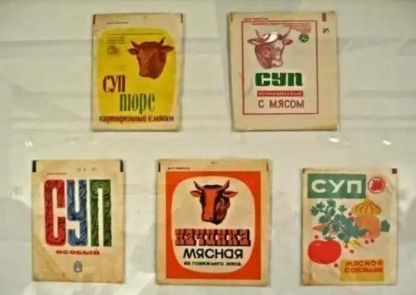 Многим сейчас вспомнятся супы с макаронными изделиями в форме звездочек, цилиндрическими кусочками сушеного мяса, маленькими кубиками моркови, щедро приправленные специями и пряностями. Но это только одна из множества разновидностей. Были еще супы бобовые, мясные с копченостями, молочные, из макаронных изделий, овощные. Даже продавались овощные супы пюреобразные, предназначенные для детей.