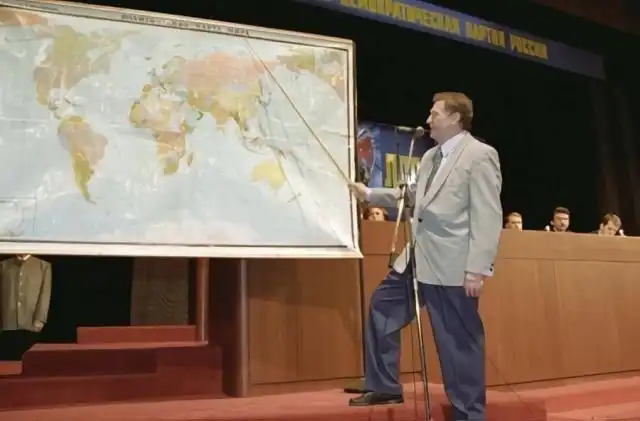 На фото лидер ЛДПР Владимир Жириновский показывает где будет мыть сапоги в Индийском океане, 25 апреля 1999 г
