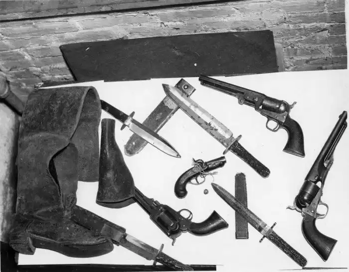 4. Оружие и ножи, связанные с убийством Линкольна и ранением майора Рэтбоуна, телохранителя президента, включая пулю из головы Линкольна. Сапоги принадлежали Буту и были на нем в день убийства. Оружие было отобрано у членов банды, связанной с Бутом