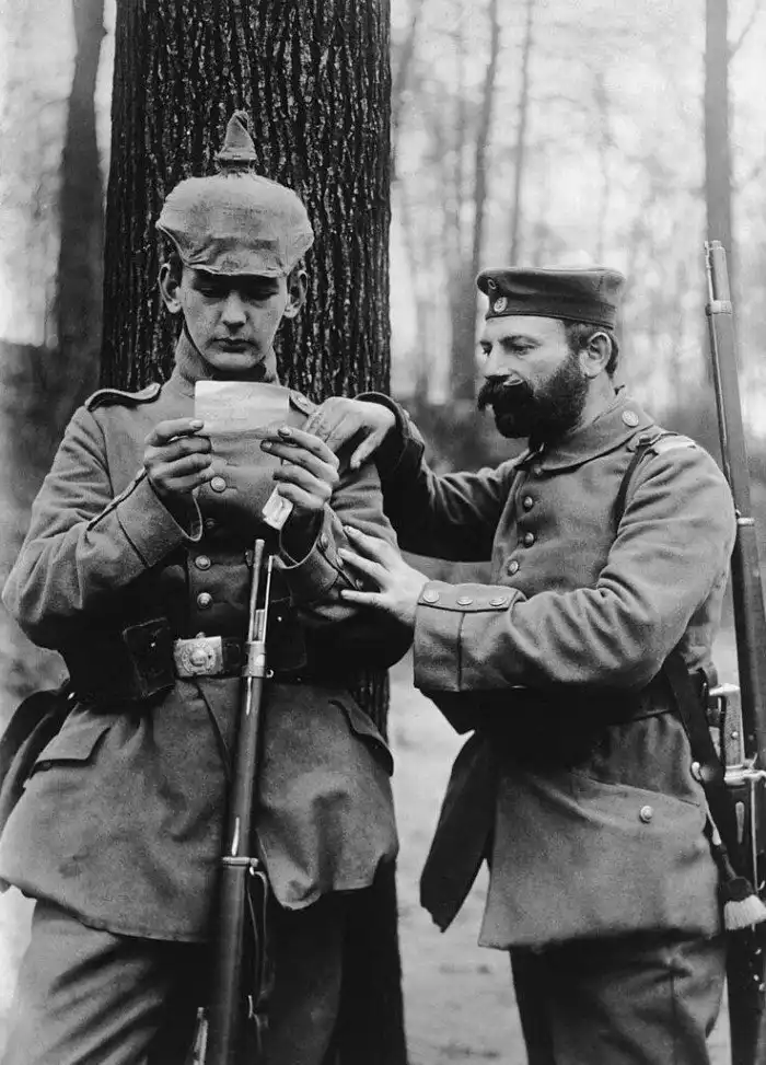 8. Отец и сын из одного немецкого полка читают письмо жены и матери на фронте, 1915 год