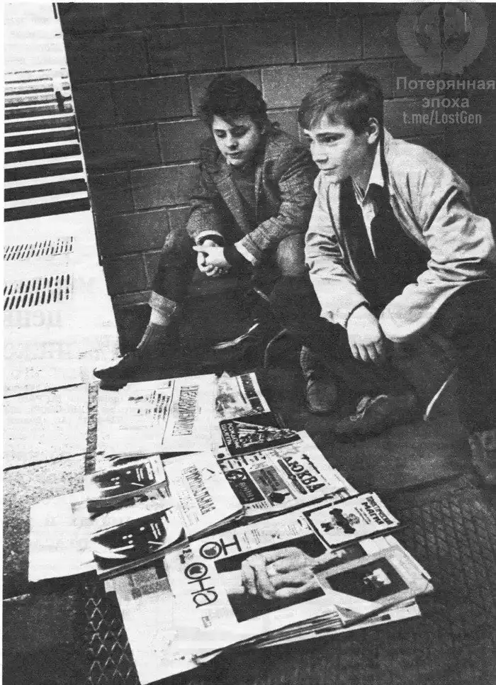 Школьники торгуют книгами и журналами в подземном переходе, Москва 1992 год.