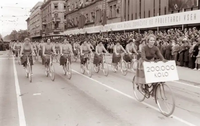 16. Завод по производству велосипедов Rog демонстрирует свой 200-тысячный велосипед на параде 1 мая 1961 года. Люблян, Югославия