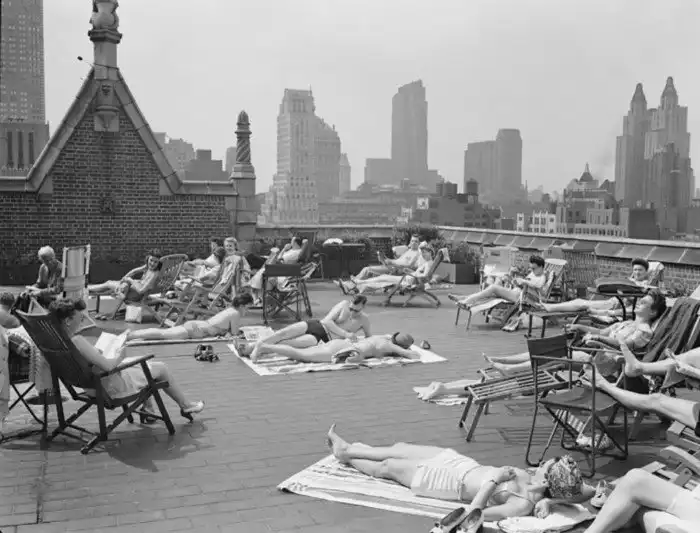 18. Солнечные ванны на крыше жилого дома в Тюдор-Сити, Нью-Йорк, 1943 год
