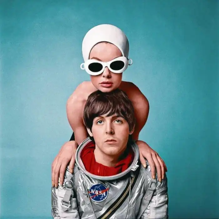 37. Пол Маккартни в скафандре NASA Mercury с Джин Шримптон (она же «Креветка») 1965 год