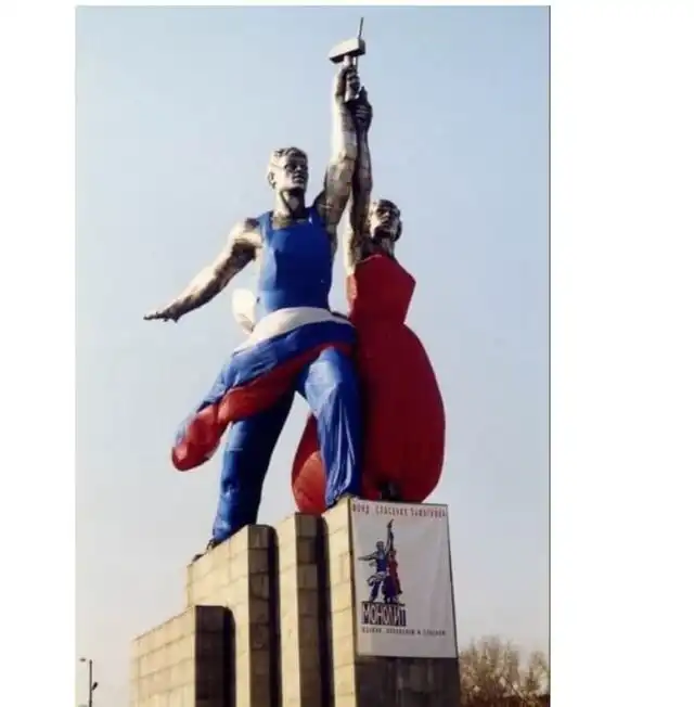 «Рабочий и колхозница» в 1998 году. Фонд спасения памятника нарядил его в цвета флага, чтобы привлечь внимание к разрушающемуся монументу.