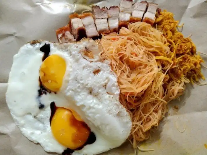 Обычный завтрак в Малайзии, состоит из том яма бихун, курицы ренданг, жаренной свинины и яичницы