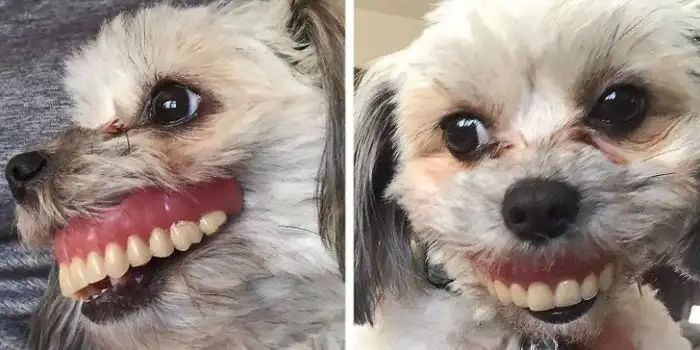 «Несколько месяцев назад, пока отец дремал, моя собака Мэгги украла его зубной протез. Когда он проснулся, увидел ее вот такой»