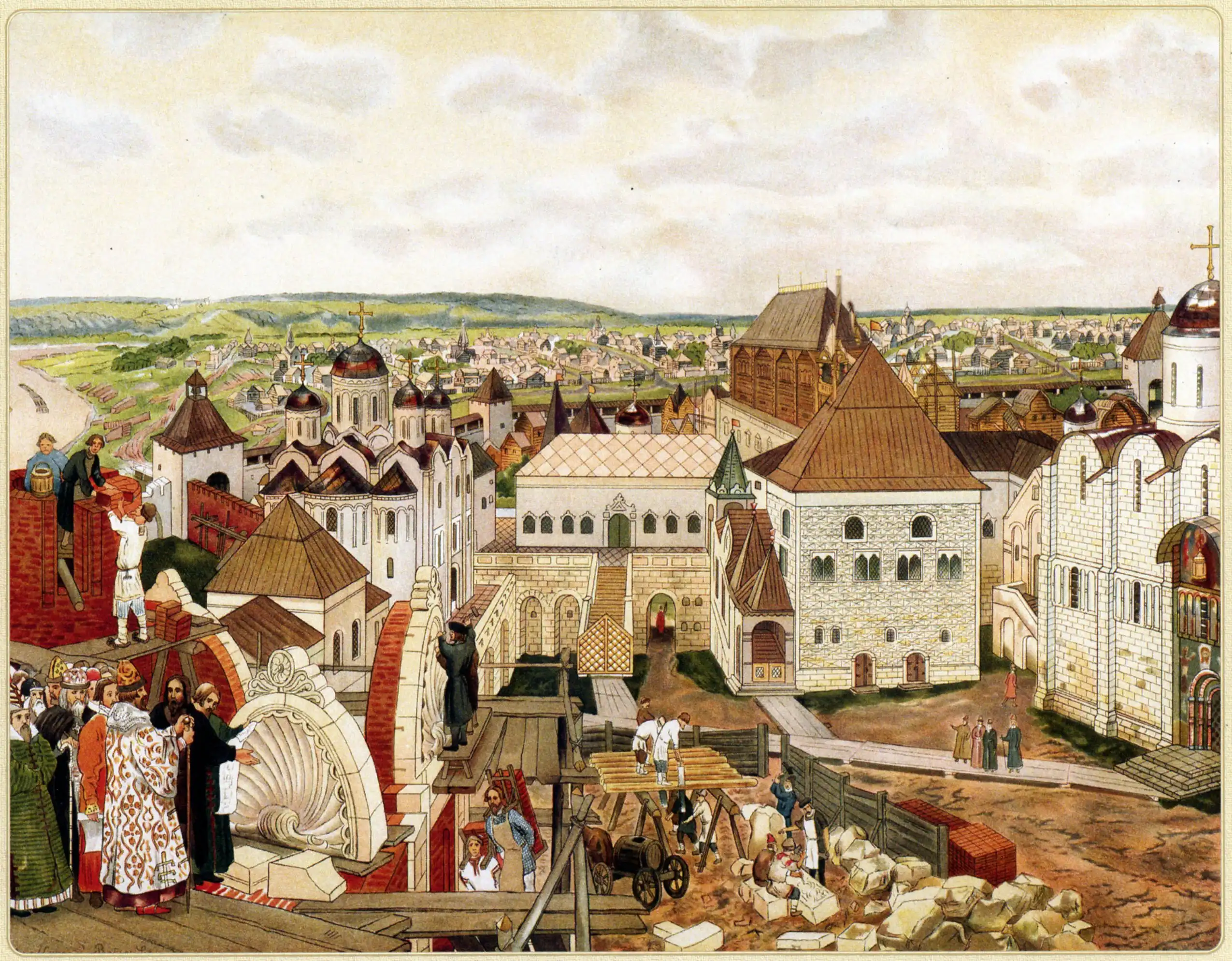 На Соборной площади уже возведены Успенский собор, Благовещенский собор и Грановитая палата.