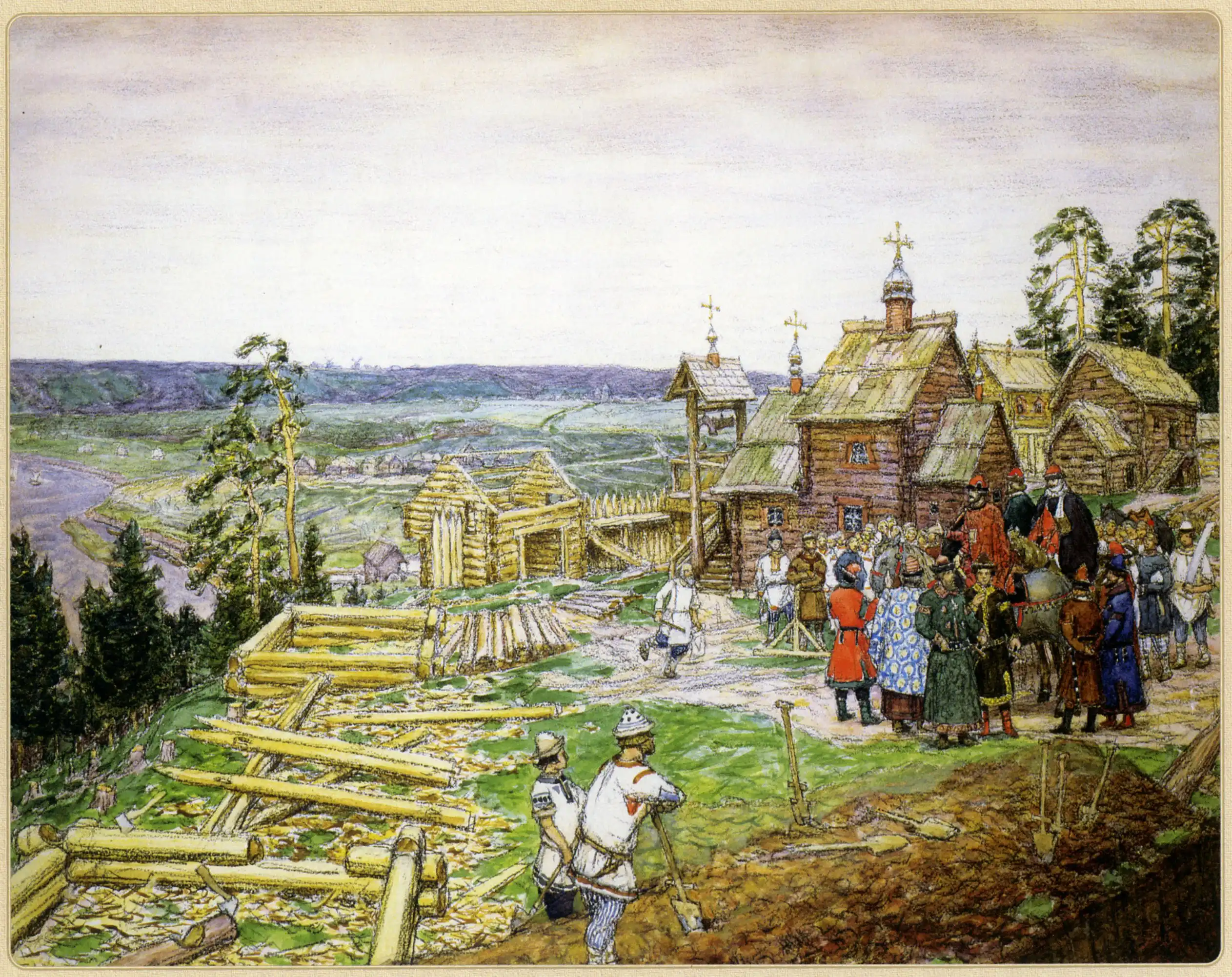 Спустя девять лет возвёл новый “град” – деревянную крепость, окружённую рвом и валом, которая охватывала в пять-шесть раз большую площадь. Именно этот исторический момент изображён на картине. Спустя два столетия белокаменная крепость на Боровицком холме получит название “Кремль”.