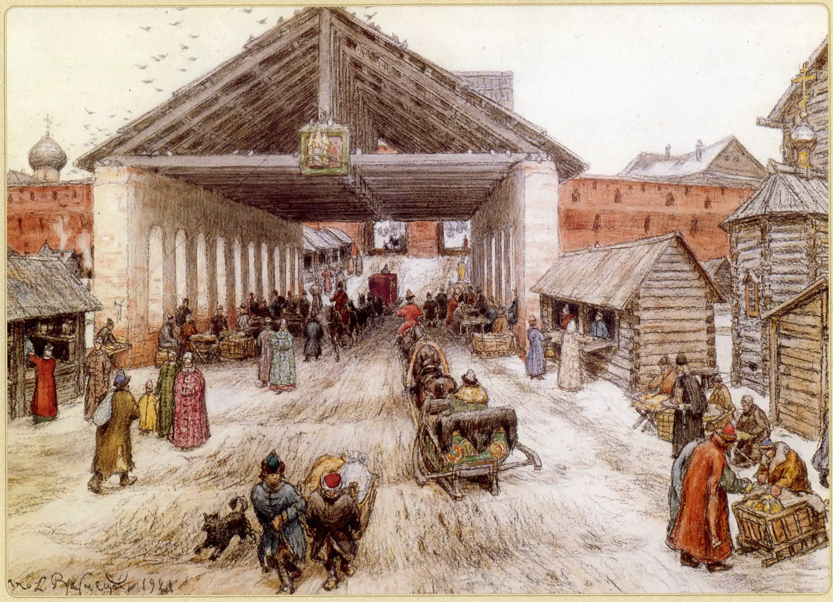 В Москве, как и в других старинных русских городах, есть площади, в названии которых присутствуют слова “застава” или “ворота”. Они были раньше, но мешали проезду транспорта, и их снесли. Именно так и произошло с Мясницкими воротами, которые вы видите на картине. По деревянному настилу едут в каретах богатые люди, а кто победнее да попроще – на санях и не по настилу. Многие москвичи спешили сюда, чтобы зайти в мясную лавку.