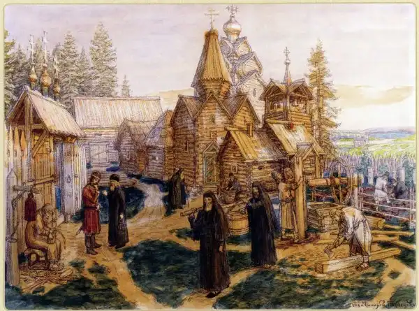 На картине изображены монахи за работой в Троице-Сергиевой лавре. Начало этой подмосковной обители было положено в 1337 году братьями-отшельниками Варфоломеем и Стефаном, переселившимися из Ростова в село Радонеж. Стефан вскоре удалился в Хотьков-Покровский монастырь, а Варфоломей остался неподалёку от Радонежа, поставив церковь во имя Святой Троицы и постригшись в иноки под именем Сергия. Собравшаяся здесь братия избрала Сергия своим игуменом. Здесь впервые на Руси был введён общежитийный монастырский устав.