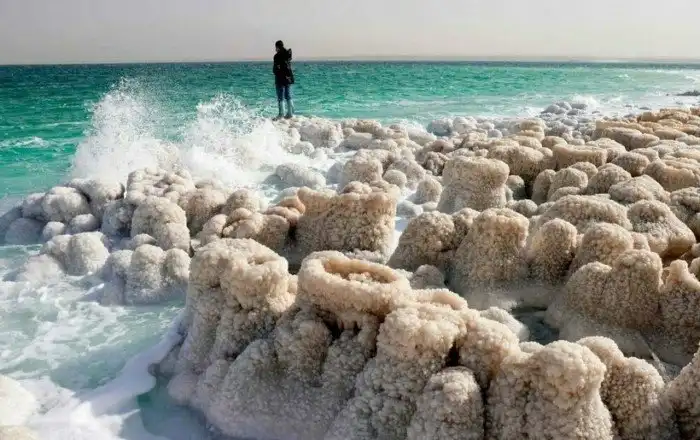 Ежегодно голубая вода отступает на метр от своих берегов, оставляя после себя удивительный лунный пейзаж из белой соли. Прошло чуть больше, чем полвека, и за это время море уменьшилось на треть. Водоем питает лишь река Иордан, а также несколько небольших речушек, которые больше создают вдоль берегов заводи и болота. Ландшафт тут удивительный, где бирюзовая вода сливается с песком, хрустящими под ногами слоями соли и маленькими голубыми заводями. А еще добавьте к этой изумительной красоте карстовые провалы, которые также выглядят впечатляюще, хотя и являются свидетелями надвигающейся экологической катастрофы.