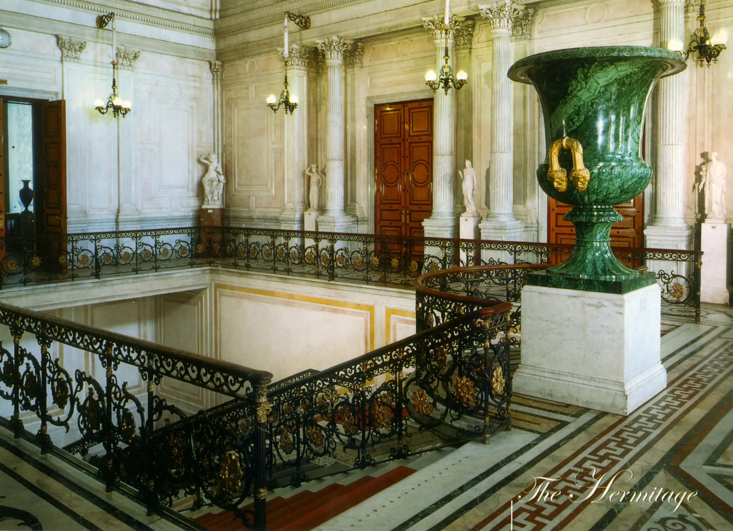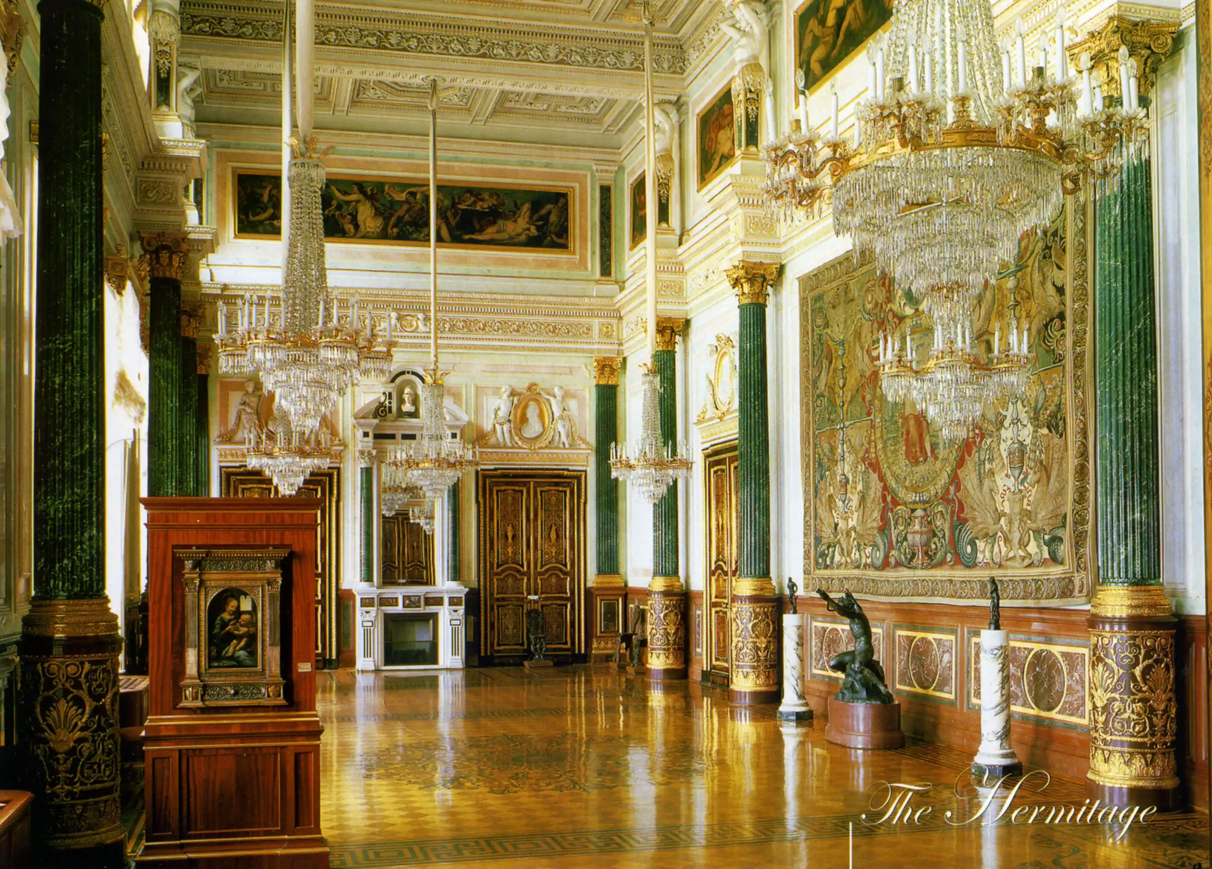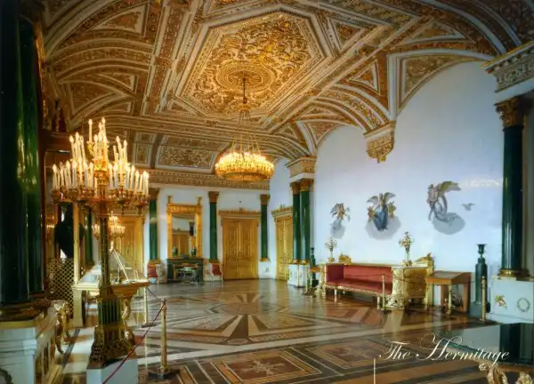 Созданный лучшими архитекторами и мастерами России XVIII – XIX вв. эрмитажный ансамбль – выдающийся исторический и архитектурный памятник, гордость отечественной культуры. Его история началась с Зимнего дворца – официальной резиденции российских императоров. Дворец был возведён в 1754-1762 гг. знаменитым зодчим XVIII века Б.-Ф. Растрелли (1700-1771) в стиле барокко. Архитектор не успел оформить интерьеры дворца: Екатерина II, ставшая императрицей в июне 1762 г., отправила его в отставку. Только два интерьера – Парадная (Иорданская) лестница и Большая церковь – сохранили растреллиевский, барочный, характер. Созданные преемниками Расстрелли дворцовые интерьеры конца XVIII – начала XIX вв, не дошли до нашего времени: они были уничтожены грандиозным пожаром, разразившимся во дворце в декабре 1837 г. Своим возрождением и красотой архитектуры Зимний дворец обязан талантам и трудам архитекторов В.П. Стасова, руководившего работами по восстановлению дворца и парадных залов, и А.П. Брюллова – создателя жилых покоев. Восстанавливая парадную часть дворца, Стасов сумел повторить, где это было возможно, прежний облик залов, подчинив их вместе с тем единому стилю строгого классицизма. От Парадной лестницы, восстановленной в стиле барокко, расходятся две парадные анфилады: Невская, включающая Аванзал, Большой (Николаевский) и Концертный залы, и Большая анфилада, идущая вглубь дворца. Она начинается Фельдмаршальским и посвящённым Петру I Петровским, или Малым Тронным, залами. Оба зала были восстановлены почти без изменений по проектам построившего их в 1833-1834 гг. архитектора О. Монферрана. За ними следует оформленный Стасовым Гербовый зал и Военная галерея, созданная в 1826 г. архитектором К.И. Росси, со спасёнными во время пожара портретами русских генералов – участников Отечественной войны 1812 года. Завершает анфиладу самый прекрасный зал дворца – Большой Тронный, Георгиевский, со стенами и коринфской колоннадой из белоснежного каррарского мрамора, оттенённого тяжёлым блеском золочёной бронзы.