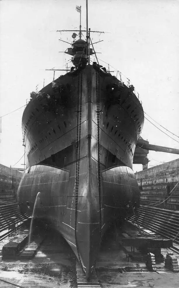 14. Британский линейный корабль HMS Royal Oak (постройки 1916 года) в сухом доке, вероятно 1920-е - 1930-е годы. Хорошо видны противоторпедные наделки (були, или блистеры), прикрывающие в подводной части борта корабля