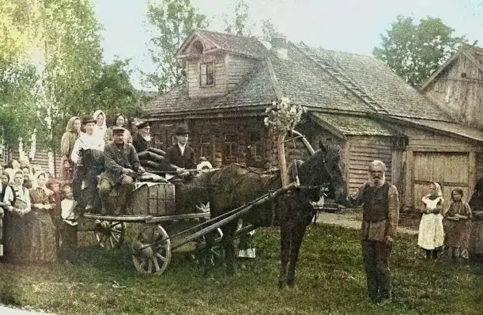 9. Перевоз приданого невесты в дом жениха. Владимирская губерния, 1914 год. (раскрашено)