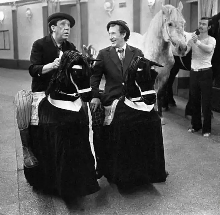 10. Народный артист СССР, лауреат Государственной премии РСФСР Юрий Никулин и заслуженный артист РСФСР Михаил Шуйдин за кулисами цирка. Москва. Фото Эдуард Эттингер, "Огонек", 1978 год