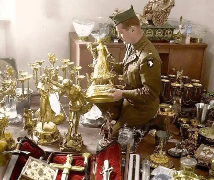 29. Американский солдат рассматривает статуэтку из чистого золота в тайнике Германа Геринга, найденном 7-й армией в пещере рядом с Шонау ам Кенигзее, Германия, 25 мая 1945 года