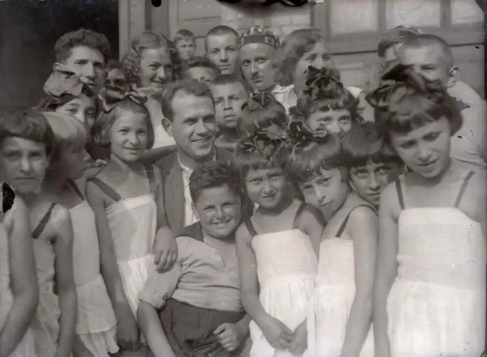 34. Б. Бабочкин, исполнитель роли Василия Чапаева, с детьми в пионерском лагере