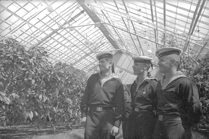 35. Всесоюзная сельскохозяйственная выставка. Моряки Каспийской военной флотилии в оранжерее