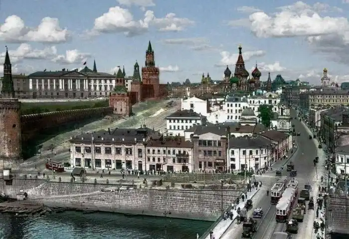 8. На фото — раскрашенный снимок площади Васильевский Спуск, до 1930-х