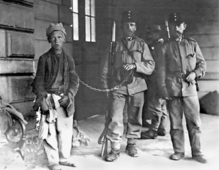 27. Галиция, июль 1915 года. Австро-венгерские солдаты с закованным в цепи украинским парубком, обвиняемым в шпионаже в пользу русских.