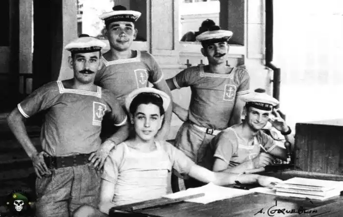 29. 18-летний морской пехотинец Ален Делон (в центре) на курсах радистов в Тулоне перед отправкой в Сайгон. 1953 год.