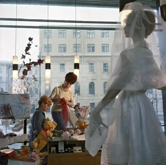 31. В магазине «Подарки» готовят витрину к 8 Марта. «Огонёк» 1967. Тункель И.Р., Ухтомский Д.