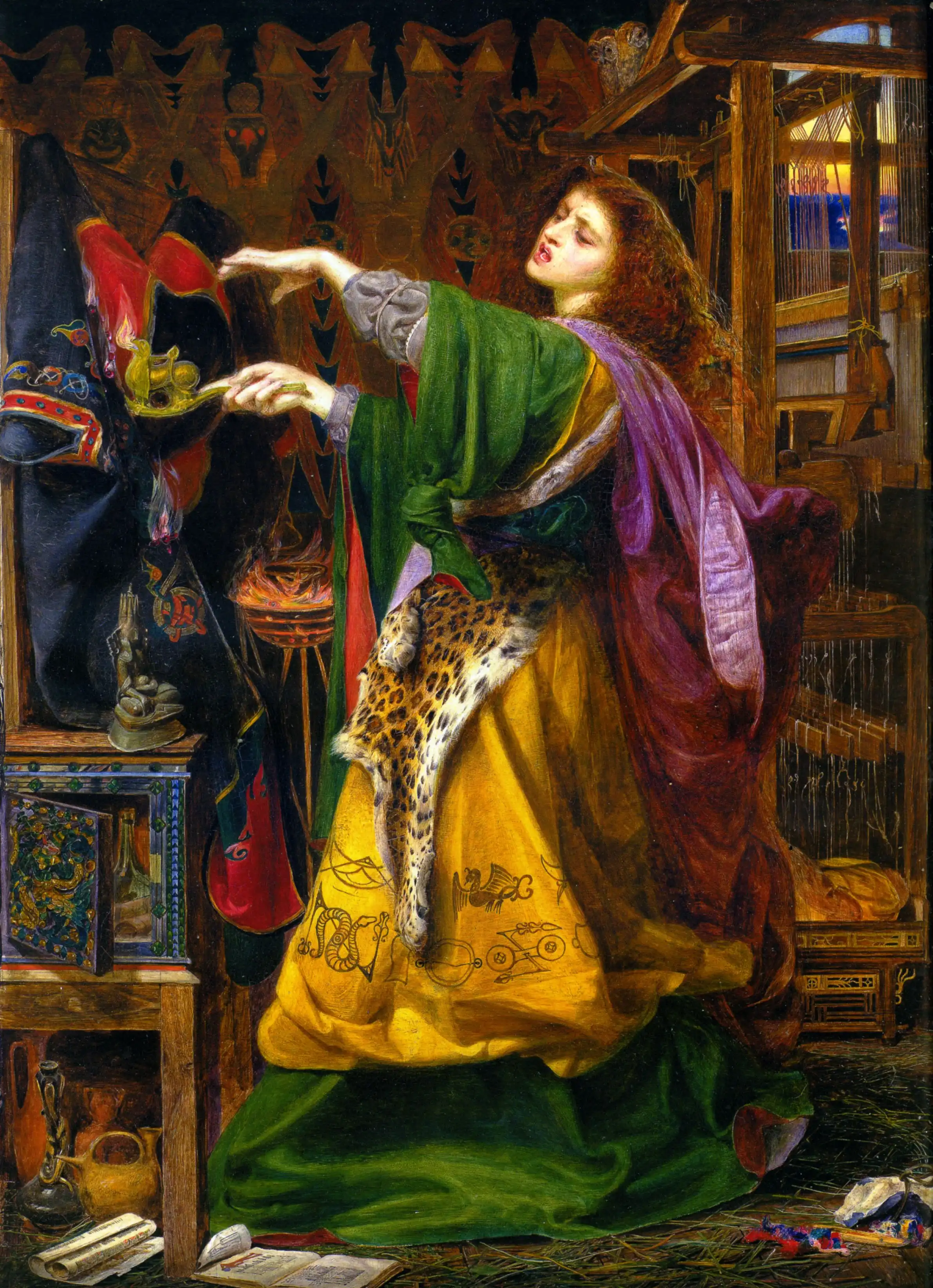 Иллюстрация к поэме Альфреда Теннисона “Волшебница Шалот”, - истории о прекрасной девушке Элейн, на которой лежит проклятие: она обязана оставаться в башне на острове Шалот и вечно ткать длинное полотно. Ей запрещено покидать башню и даже смотреть из окна. Покинув своё место заточения ради сэра Ланселота, Элейн засыпает вечным сном.