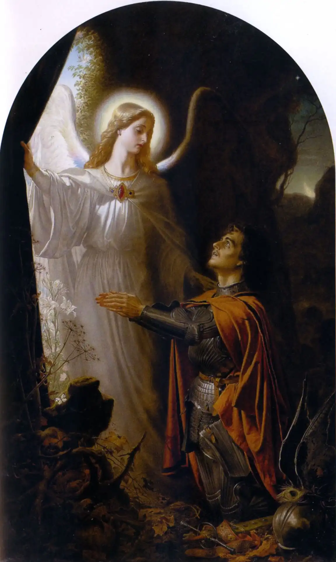 В ночь на 24 августа 1572 года, в День святого Варфоломея, во время торжеств в честь свадьбы Генриха Наваррского и Маргариты де Валуа, в Париже произошла массовая резня гугенотов, вошедшая в историю как Варфоломеевская ночь. На картине девушка-католичка, чтобы спасти возлюбленного-гугенота от гибели, тщетно пытается надеть на руку юноши спасительный знак – белую повязку.