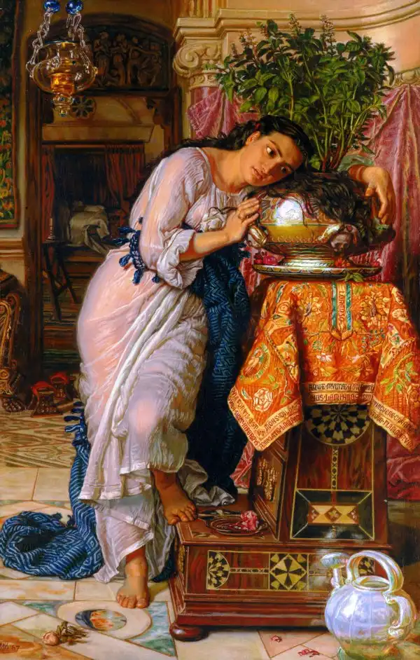 Картина написана по мотивам поэмы Джона Китса “Изабелла, или Горшок с базиликом”, сюжет которой, в свою очередь, заимствован из “Декамерона” Бокаччо. Сюжет картины обращает зрителя к тому эпизоду поэмы, когда безутешная Изабелла горюет у горшка с базиликом, куда она спрятала голову своего возлюбленного – бедного подмастерья Лоренцо, убитого её братьями.