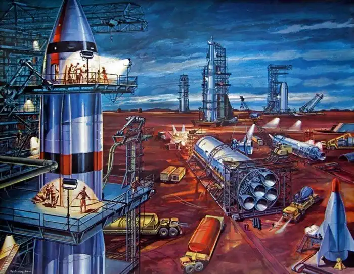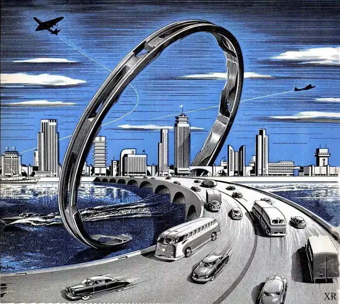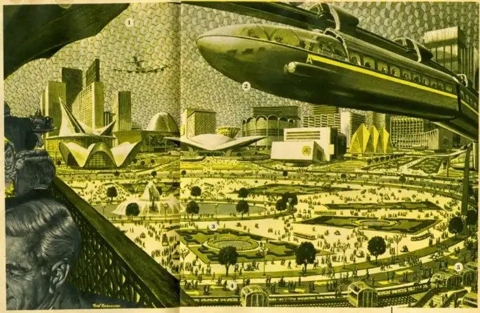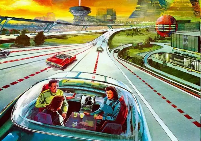 Настоящий рассвет ретрофутуризма в США относится к 60-м годам. Война закончилась совсем недавно, вовсю цветет эпоха бэбибума, а будущее кажется безоблачным. Да и война во Вьетнаме еще не началась.Поэтому в послевоенные годы футурологи мечтали о домах и городах под стеклянными куполами, в которых можно будет спрятаться от непогоды. Еще они боялись перенаселения, и поэтому предлагали строить просто огромные по размерам зернохранилища, чтобы обеспечить едой все населения. А еще – выращивать гигантские овощи или вовсе перейти на «пищевые таблетки».Уже тогда проблемой в Америке были пробки на дорогах. Улицы, по мнению тех мечтателей, должны были целиком и полностью принадлежать пешеходам. К чему они машинам, если они будут летать по воздуху или ездить по многоуровневым эстакадам, поверхности которых будут очищаться с помощью подогрева.