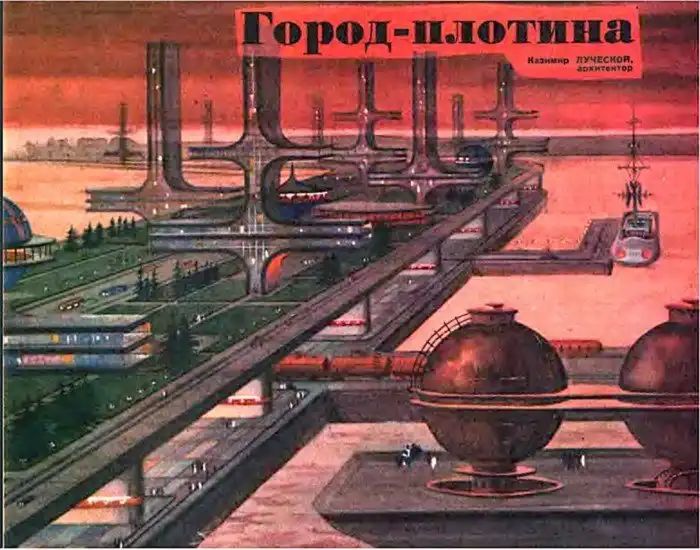 Например, в 1974 году в журнале «Техника-молодежи» был представлен проект города двухтысячного года в Беринговом проливе за авторством архитектора Казимира Луческого. Это, своего рода, город-плотина.«Давайте совершим путешествие по необычному городу, чьи контуры изображены живописцем на развороте. Этот город будущего соединяет два материка — Азию и Америку. Назовем его по имени пролива — город Берингов», — говорилось в описании проекта.