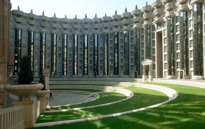 В Европе тоже был свой футуризм. Например, в Париже есть жилой комплекс «Пространство Абраксаса», спроектированный испанцем Рикардо Бофиллом. Он же засветился в фильме-антиутопии «Бразилия» режиссера Терри Гиллиама. А еще он похож на декорации «Голодных игр», но утверждать точно мы не будем.