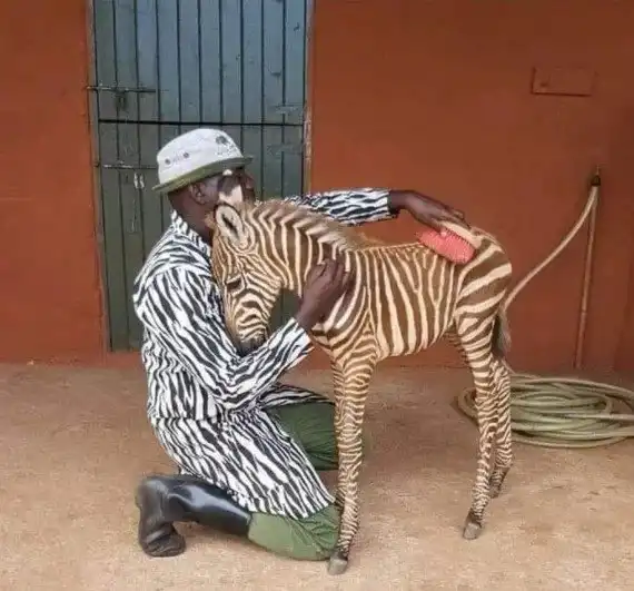 Работник фонда охраны дикой природы носит специальное пальто для ухода за осиротевшим жеребёнком зебры