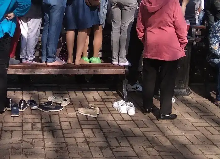 Люди смотрят парад со скамейки