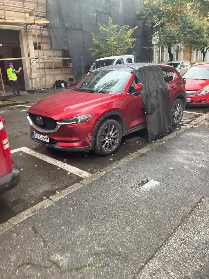 Случайно оставил свою машину с открытым люком, и пошёл дождь. Рабочие накрыли его плёнкой