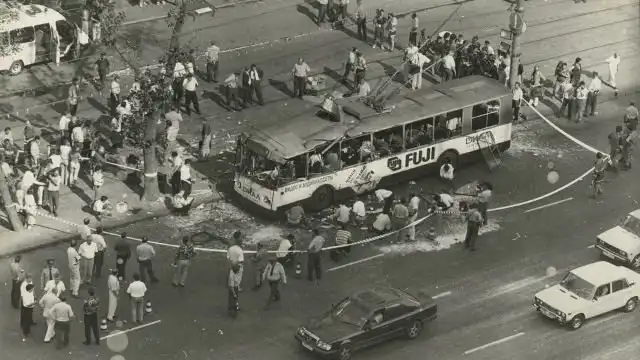 Взорванный троллейбус у станции метро Алексеевская. Москва, Россия, 12 июля 1996 года.