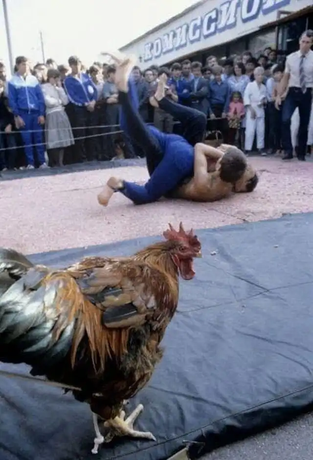 Петух наблюдает за схваткой борцов-любителей на торговой площади в Кишинёве, Молдавия 1989 год.