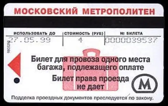 Карточка для провоза багажа в московском метро (её нужно было пропускать через турникет). 1999 год. Стоимость 4 рубля