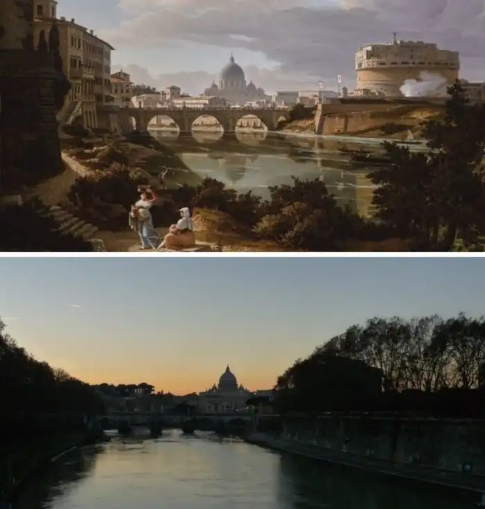 Вид на Рим с берега Тибра на картине 1834 года и на современной фотографии