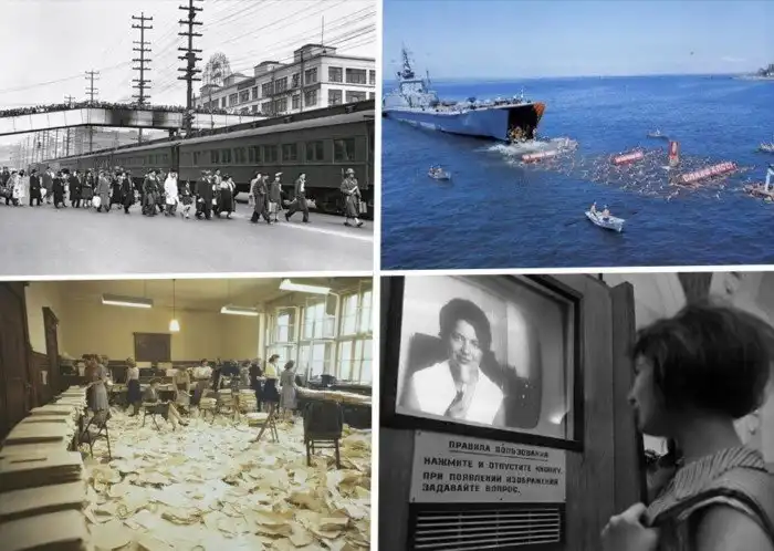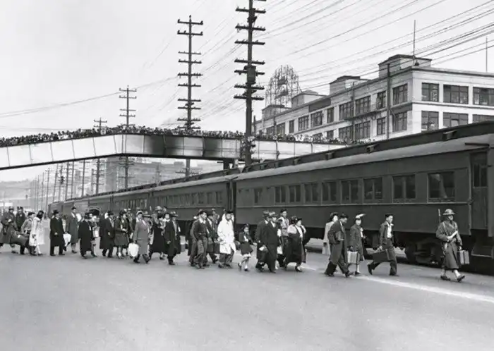 18. Горожане Сиэтла наблюдают с моста, как американцев японского происхождения отправляют в лагеря для интернированных. США, 1942 год