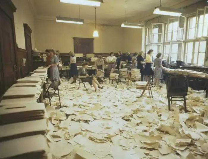 6. Секретари в копировальной комнате во время Нюрнбергского процесса, Дворец юстиции в Нюрнберге, Германия, 1948 год