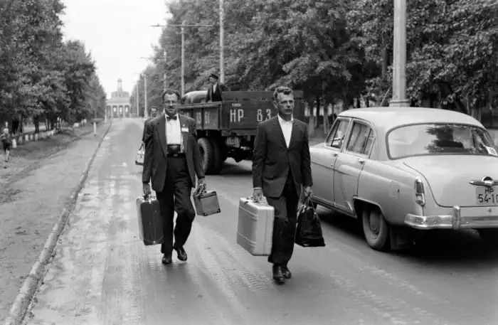 8. Новосибирск. Ул.Аэтопорт. Американцы из делегации Р.Никсона, топают пешком из здания Аэровокзала. Фотограф Ховард Сочурек. На заднем плане ГАЗ-51 с надписью "Такси" 1959 год
