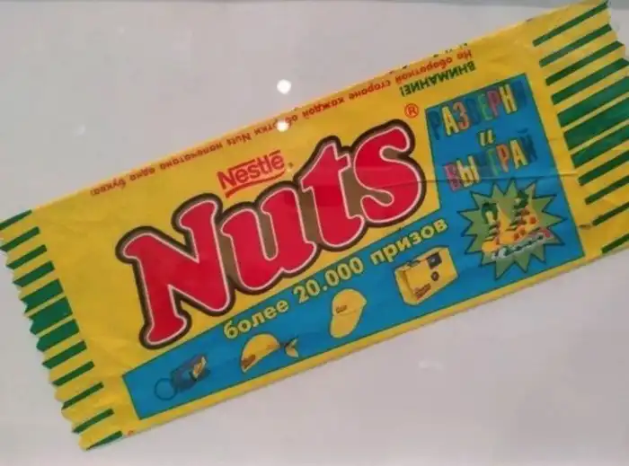 1997 год. Конкурс от Nuts: надо было собрать все 4 буквы внутри обертки и отправить по почте. Можно было выиграть бандану или даже ролики!