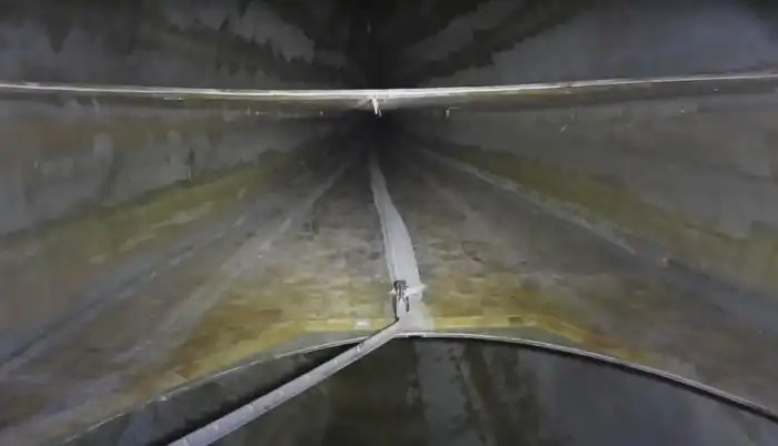 Залезли внутрь. И тут нас ждёт разочарование. Оказывается внутри лопасти невозможно не то что бегать, а даже нормально передвигаться. Потому что там внутри есть две продольные перегородки. Наверняка они нужны для дополнительной жёсткости. И как можно видеть, лопасть изнутри разделена ими на три секции.