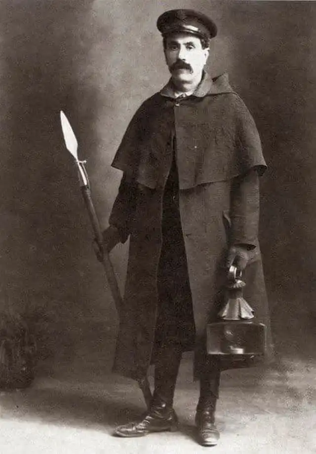Зажигатель уличных фонарей с копьём для защиты во время дежурств на улицах ночного города. Испания, Мадрид, начало XX века.