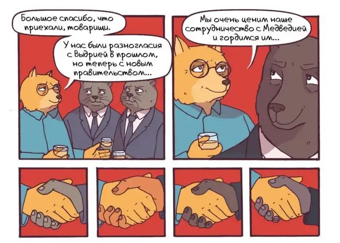 Однако некоторые нравы будут знакомы тем, кто прожил в странах СНГ до 1990-х годов. Причём здесь вообще показаны международные отношения, где Собакистан сотрудничает с Медведией.