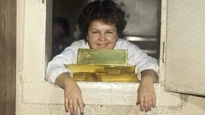 3. Работница склада драгоценных металлов в Москве позирует со слитками золота, 80-е