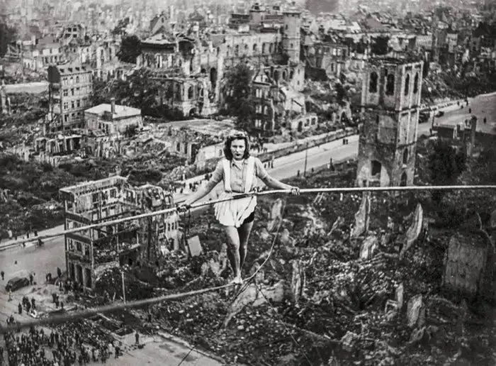 8. Маргрет Циммерманн идёт по канату над руинами Кельна, Германия, 1946 год