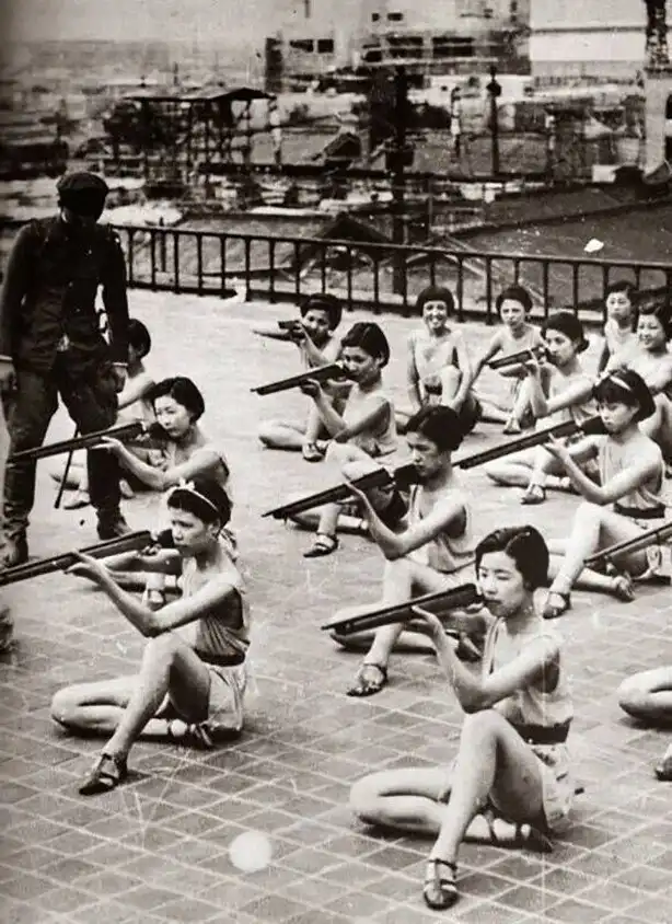 13. Японские школьницы, позируют для съемки на занятии по военной подготовке, где военный инструктор преподает им умение держать оружие правильно. 1930-е годы
